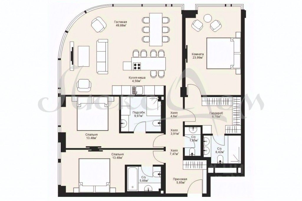Планировка: кухня-гостиная, 3 мастер спальни с гардеробной и с\у, гостевой с\у.