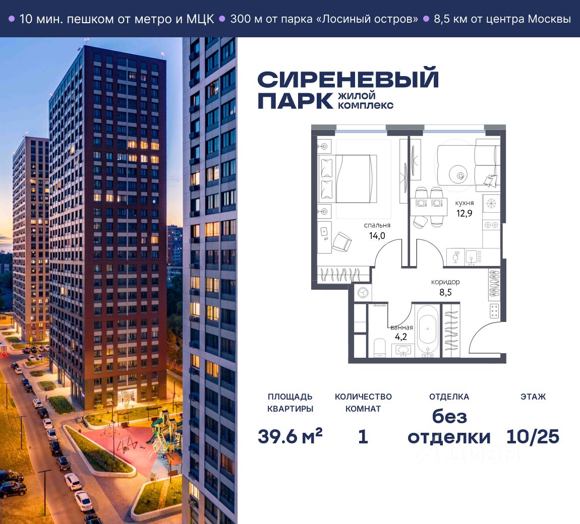 Продаётся просторная 1-комнатная квартира общей площадью 39.6 м² на 10 этаже в новом жилом комплексе "Сиреневый парк", расположенном в Восточном административном округе Москвы на улице Тагильская. Всего 10 минут ходьбы от станции метро "Бульвар Рокоссовского" и одноимённой платформы МЦК.