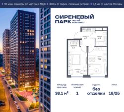 Продаётся просторная 1-комнатная квартира общей площадью 38.1 м² на 18 этаже в новом жилом комплексе "Сиреневый парк", расположенном в Восточном административном округе Москвы на улице Тагильская. Всего 10 минут ходьбы от станции метро "Бульвар Рокоссовского" и одноимённой платформы МЦК.