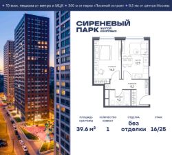 Продаётся просторная 1-комнатная квартира общей площадью 39.6 м² на 16 этаже в новом жилом комплексе "Сиреневый парк", расположенном в Восточном административном округе Москвы на улице Тагильская. Всего 10 минут ходьбы от станции метро "Бульвар Рокоссовского" и одноимённой платформы МЦК.