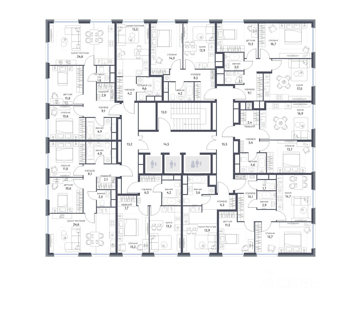 - мастер-спальни с собственными санузлами,
