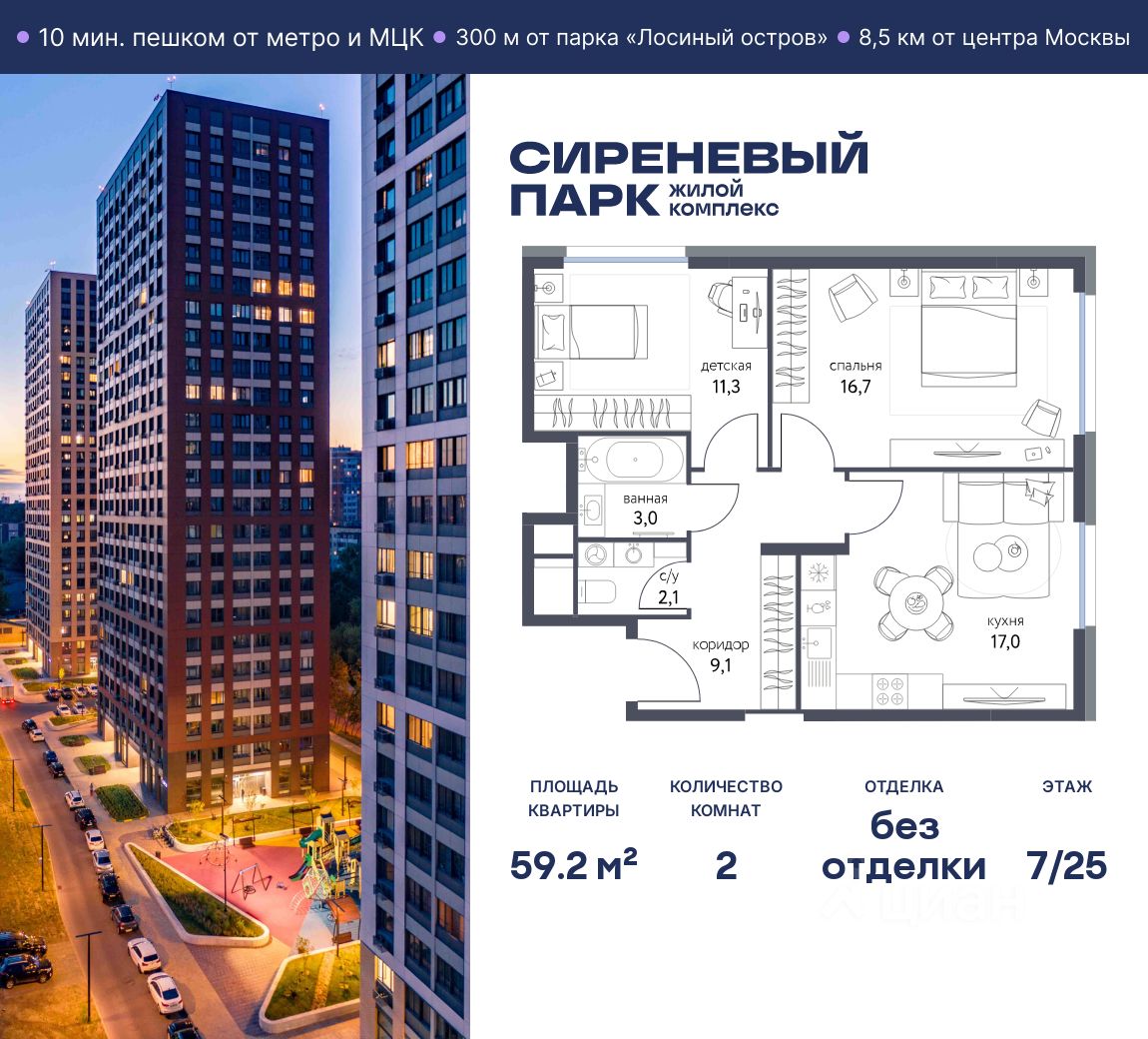 Продаётся просторная 2-комнатная квартира общей площадью 59.2 м² на 7 этаже в новом жилом комплексе "Сиреневый парк", расположенном в Восточном административном округе Москвы на улице Тагильская. Всего 10 минут ходьбы от станции метро "Бульвар Рокоссовского" и одноимённой платформы МЦК.