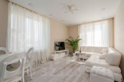 При общей площади квартиры в 51.8 кв. м. в ней грамотно использован каждый сантиметр. Все эргономично, уютно и удобно, ремонт делали с любовью и вниманием к каждой детали. Все, что Вы видите на фото, остается в квартире. Планировка предполагает размещение кухни-гостиной, спальни, с/у и вместительной гардеробной. В квартире выполнен качественный дизайнерский ремонт, Вам не придется тратить время и средства на дополнительные вложения — просто заезжайте и живите.
