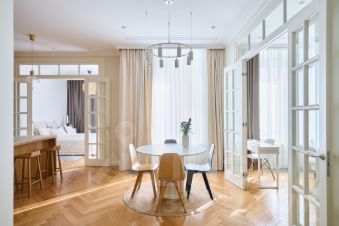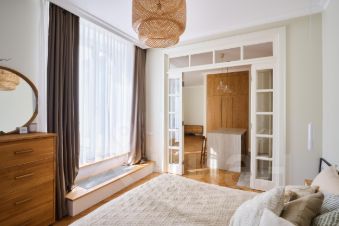 Интерьер в мягких теплых природных тонах добавляет ощущение уюта и утонченности. Изящное планировочное решение - анфилада комнат - визуально расширяет пространство, а высокие потолки 3м и панорамные деревянные окна на юг и юго-запад наполняют его естественным светом.