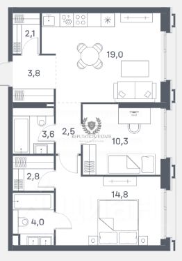 Квартира общей площадью 62,90 кв.м. Кухня-гостиная 19,0 кв.м., 2 спальни 14,8 (с нишей для гардеробной и мастер-спальней) и 10,3 кв.м.