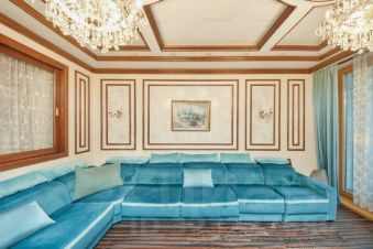 Высококачественная отделка с использованием дорогостоящих натуральных материалов: ценные породы древесины (дуб, лиственница), мрамор, элементы декора ручной работы, кессоные потолки с орнаментом