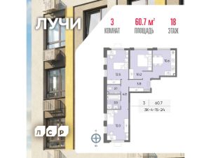 Продается 3-комнатная квартира общей площадью 60.7 кв. метров на 18 этаже жилого комплекса Лучи.