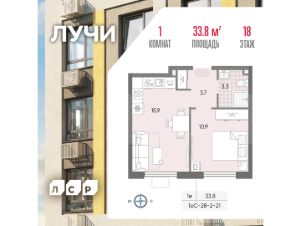 Продается 1-комнатная квартира общей площадью 33.8 кв. метров на 18 этаже жилого комплекса Лучи.