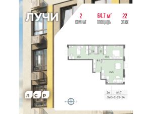 Продается 2-комнатная квартира общей площадью 64.7 кв. метров на 22 этаже жилого комплекса Лучи.