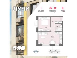Продается 1-комнатная квартира общей площадью 36.7 кв. метров на 13 этаже жилого комплекса Лучи.