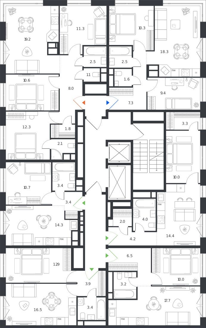 между квартирами светлые холлы. керамогранитный пол, энергоэффективная подсветка и цветовые акценты. никакой монотонности.