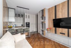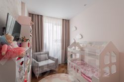При ремонте делали полную шумо- и гидроизоляцию пола. Теплый пол везде, где керамогранит, много вместительных шкафов, местам для хранения было уделено особое внимание. Все сделано с вниманием к мелочам, душой и любовью. Ремонт делали для себя, использовались только натуральные материалы, пол- инженерная доска, подоконники из камня, вся техника BOSCH и ASKO, система отопления Rehau, мебель на заказ.