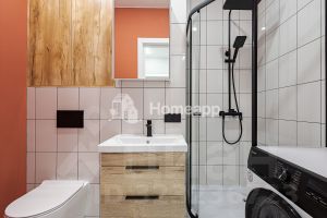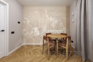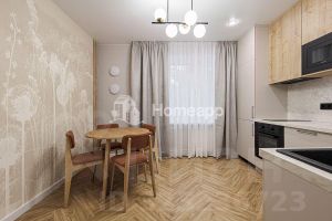 Интерьер выполнен в современном стиле с использованием качественных материалов. Квартира полностью укомплектована мебелью и техникой — установлены кондиционер, водонагреватель, посудомоечная и стиральная машины, а также вместительные системы хранения.
