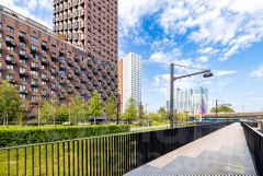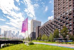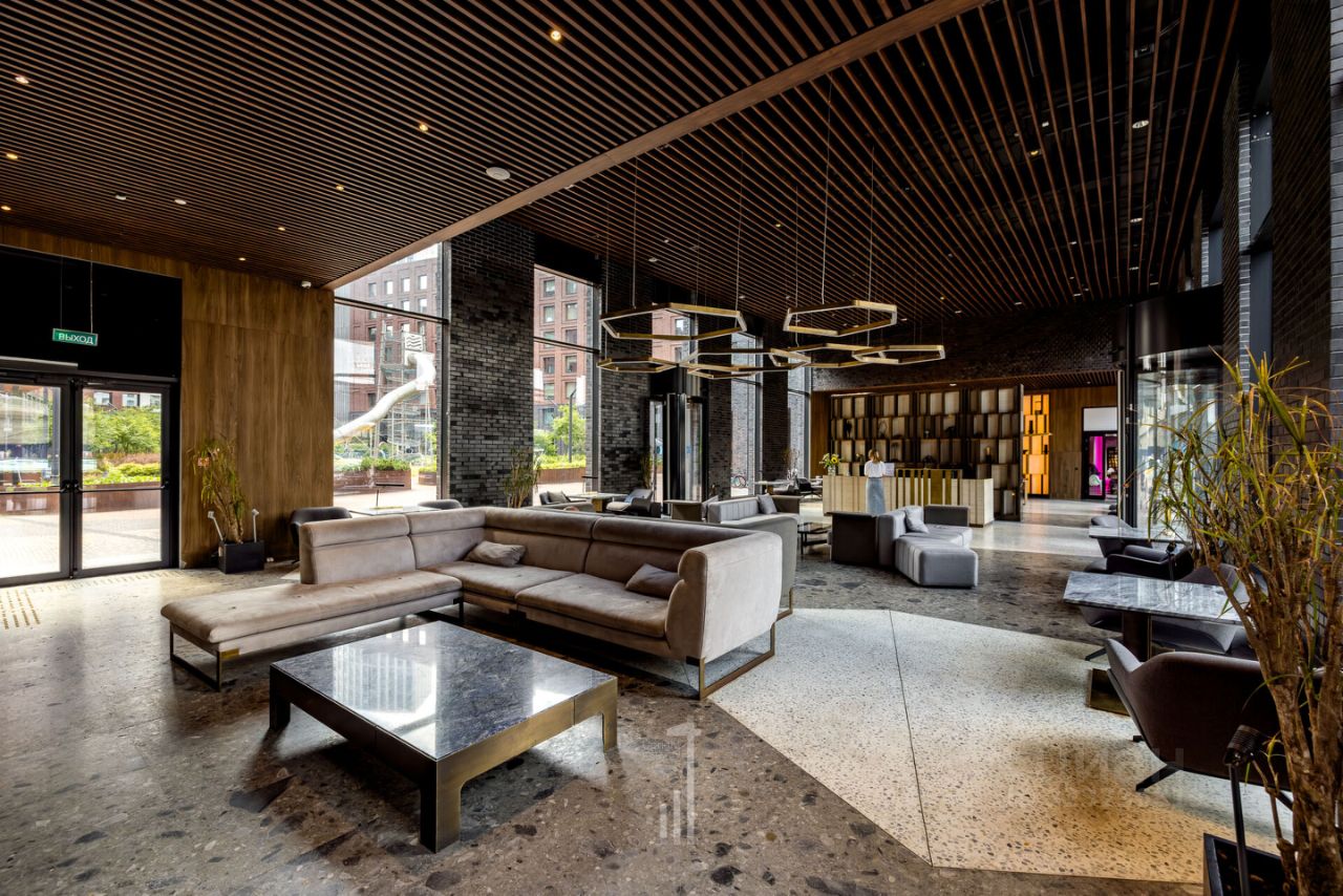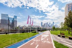 Закрытая внутренняя территория ЖК с детскими и спортивной площадками, двор без машин, есть отдельный выход сразу на набережную. На первых этажах - магазины, кафе, сфера услуг и пр.