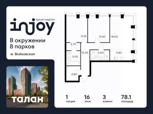 Прямая продажа от застройщика. В жилом квартале, расположенном в Войковском районе Москвы, продаётся 3-комнатная квартира площадью 78.1 кв.м без отделки. Квартира расположена на 16 этаже 35-этажного дома, корпус 1, в жилом квартале бизнес-класса INJOY.