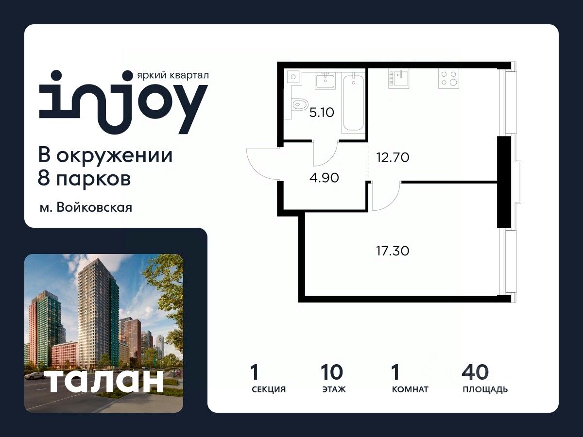 Прямая продажа от застройщика. В жилом квартале, расположенном в Войковском районе Москвы, продаётся 1-комнатная квартира площадью 40 кв.м без отделки. Квартира расположена на 10 этаже 35-этажного дома, корпус 1, в жилом квартале бизнес-класса INJOY.
