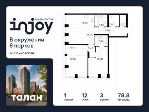 Прямая продажа от застройщика. В жилом квартале, расположенном в Войковском районе Москвы, продаётся 3-комнатная квартира площадью 78.8 кв.м без отделки. Квартира расположена на 12 этаже 35-этажного дома, корпус 1, в жилом квартале бизнес-класса INJOY.