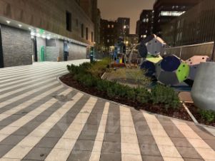 - Закрытый внутренний двор без машин. Он огорожен и озеленён, безопасен для детей. Во дворе есть лаунж-зона с ландшафтным дизайном, арт-объектами и малыми архитектурными формами.