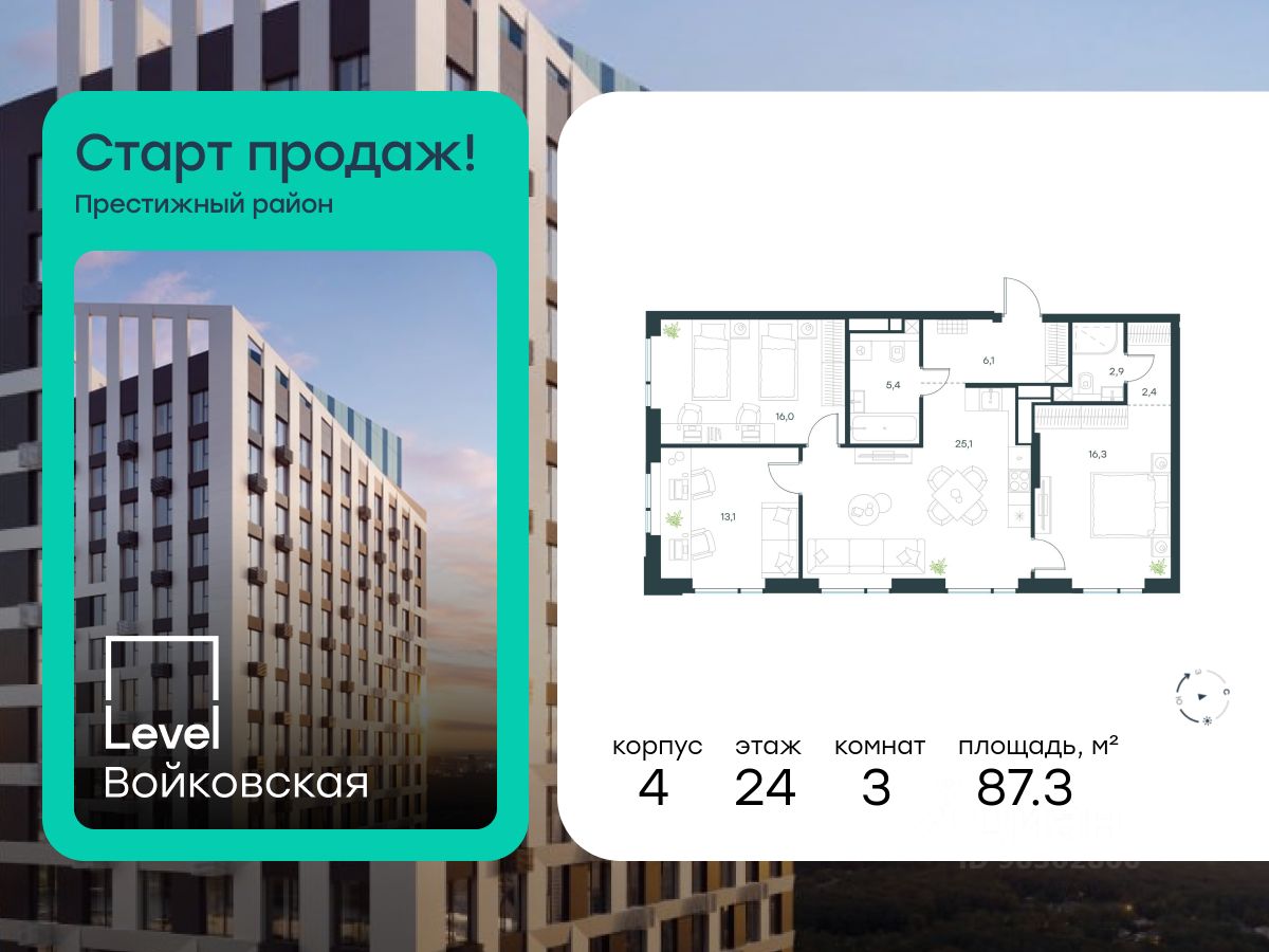 Продается 3-комнатная квартира площадью 87.30 кв. м с отделкой. Квартира находится на 24 этаже 26-этажного корпуса 4, в новом жилом комплексе бизнес-класса Level Войковская, расположенном рядом с живописным заповедником "Покровское-Стрешнево" (застройщик - компания Level Group/Левел групп).