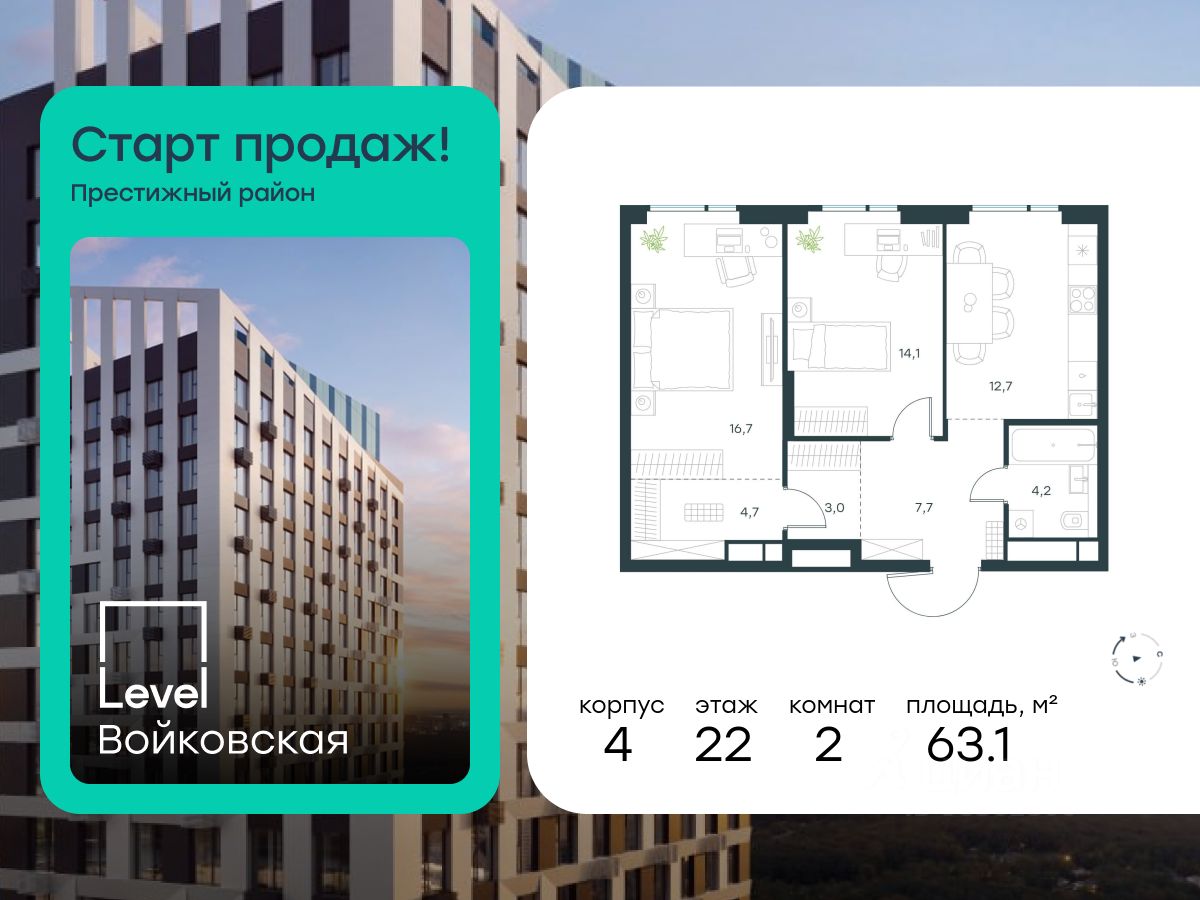 Продается 2-комнатная квартира площадью 63.10 кв. м с отделкой. Квартира находится на 22 этаже 26-этажного корпуса 4, в новом жилом комплексе бизнес-класса Level Войковская, расположенном рядом с живописным заповедником "Покровское-Стрешнево" (застройщик - компания Level Group/Левел групп).
