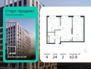 Продается 2-комнатная квартира площадью 62.80 кв. м с отделкой. Квартира находится на 24 этаже 26-этажного корпуса 4, в новом жилом комплексе бизнес-класса Level Войковская, расположенном рядом с живописным заповедником "Покровское-Стрешнево" (застройщик - компания Level Group/Левел групп).