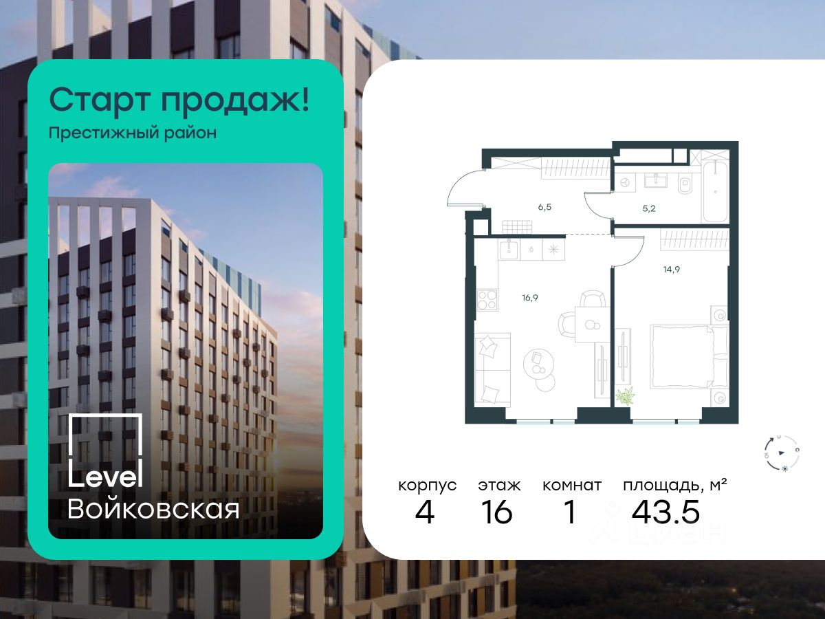 Продается 1-комнатная квартира площадью 43.50 кв. м с отделкой. Квартира находится на 16 этаже 26-этажного корпуса 4, в новом жилом комплексе бизнес-класса Level Войковская, расположенном рядом с живописным заповедником "Покровское-Стрешнево" (застройщик - компания Level Group/Левел групп).