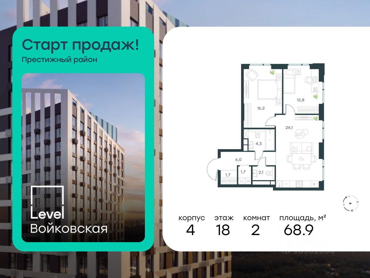 Продается 2-комнатная квартира площадью 68.90 кв. м с отделкой. Квартира находится на 18 этаже 26-этажного корпуса 4, в новом жилом комплексе бизнес-класса Level Войковская, расположенном рядом с живописным заповедником "Покровское-Стрешнево" (застройщик - компания Level Group/Левел групп).
