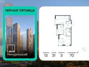 В жилом квартале, расположенном на границе с природным заказником "Долина реки Очаковки", продаётся 3-комнатная квартира площадью 70.00 кв.м без отделки. Квартира расположена на 31 этаже 31-этажного корпуса Корпус 13 в жилом комплексе бизнес-класса Level Мичуринский (компания Level Group/Левел групп).