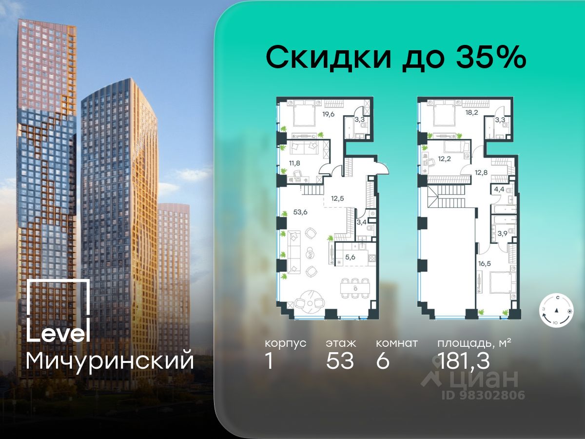 В жилом квартале, расположенном на границе с природным заказником "Долина реки Очаковки", продаётся многокомнатная квартира площадью 181.30 кв.м без отделки. Квартира расположена на 53 этаже 54-этажного корпуса 1 в жилом комплексе бизнес-класса Level Мичуринский (компания Level Group/Левел групп).