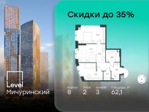 В жилом квартале, расположенном на границе с природным заказником "Долина реки Очаковки", продаётся 3-комнатная квартира площадью 62.10 кв.м без отделки. Квартира расположена на 2 этаже 48-этажного корпуса 8 в жилом комплексе бизнес-класса Level Мичуринский (компания Level Group/Левел групп).