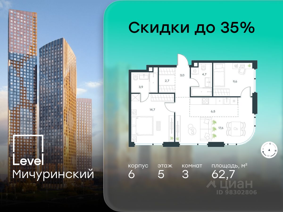 В жилом квартале, расположенном на границе с природным заказником "Долина реки Очаковки", продаётся 3-комнатная квартира площадью 62.70 кв.м без отделки. Квартира расположена на 5 этаже 20-этажного корпуса 6 в жилом комплексе бизнес-класса Level Мичуринский (компания Level Group/Левел групп).