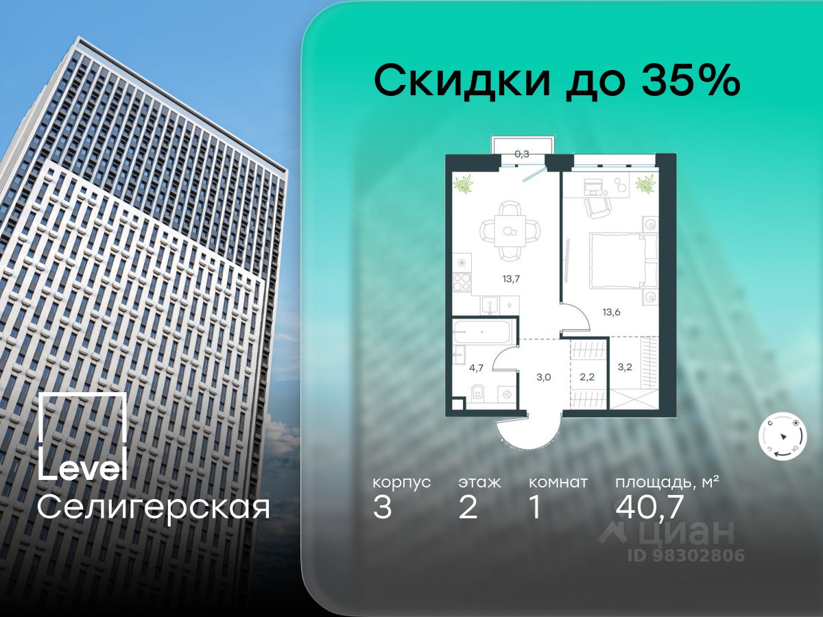 В жилом квартале, расположенном в южной части района Западное Дегунино, продаётся 1-комнатная квартира площадью 40.70 кв.м без отделки. Квартира расположена на 2 этаже 40-этажного корпуса 3 в жилом комплексе комфорт-класса Level Селигерская (компания Level Group/Левел групп).