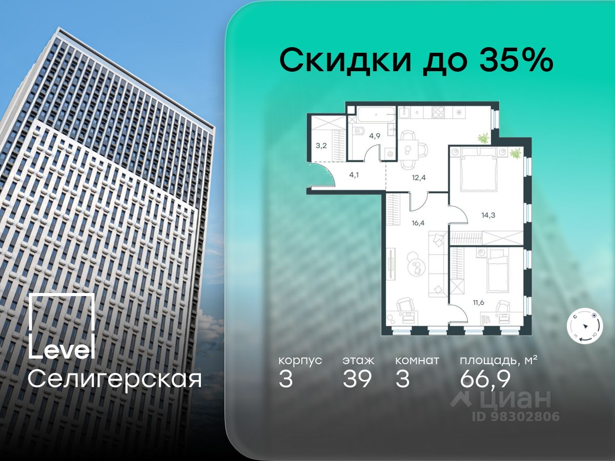 В жилом квартале, расположенном в южной части района Западное Дегунино, продаётся 3-комнатная квартира площадью 66.90 кв.м без отделки. Квартира расположена на 39 этаже 40-этажного корпуса 3 в жилом комплексе комфорт-класса Level Селигерская (компания Level Group/Левел групп).