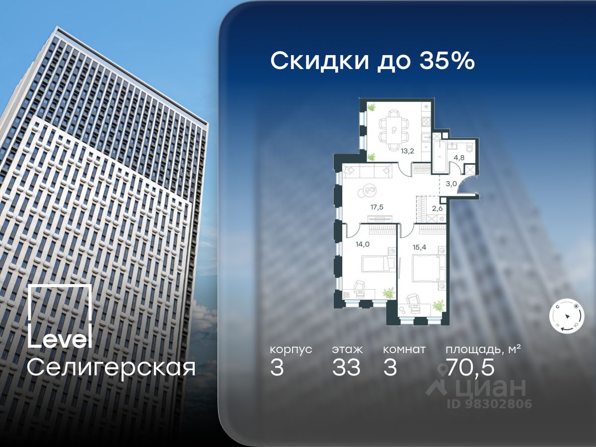 В жилом квартале, расположенном в южной части района Западное Дегунино, продаётся 3-комнатная квартира площадью 70.50 кв.м без отделки. Квартира расположена на 33 этаже 40-этажного корпуса 3 в жилом комплексе комфорт-класса Level Селигерская (компания Level Group/Левел групп).