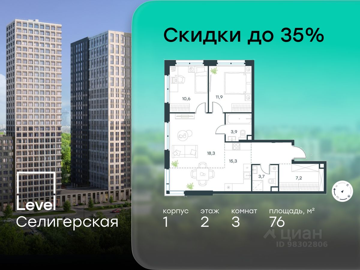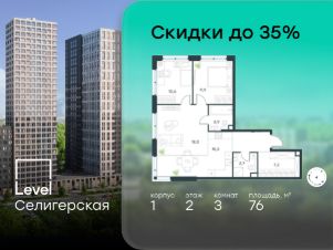 В жилом квартале, расположенном в южной части района Западное Дегунино, продаётся 3-комнатная квартира площадью 76.00 кв.м без отделки. Квартира расположена на 2 этаже 30-этажного корпуса 1 в жилом комплексе комфорт-класса Level Селигерская (компания Level Group/Левел групп).