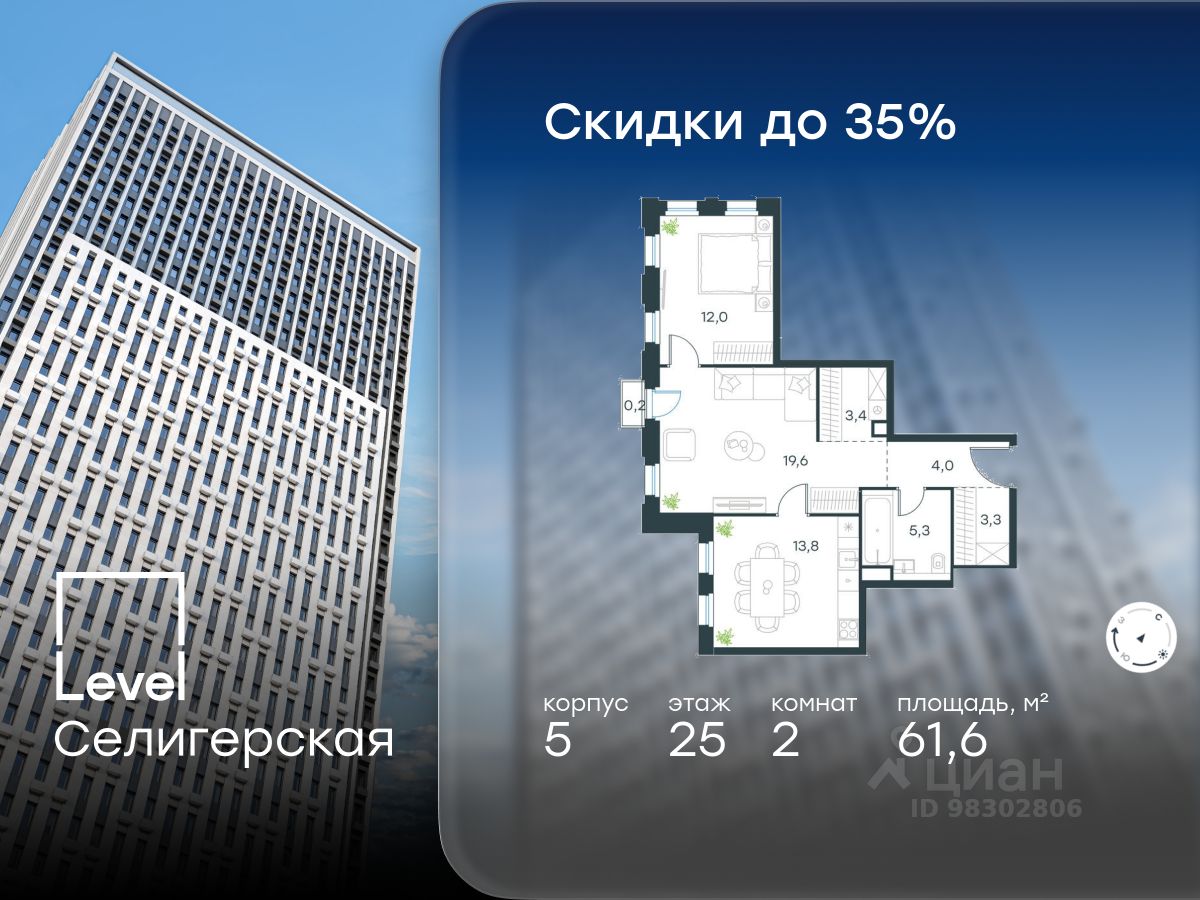 В жилом квартале, расположенном в южной части района Западное Дегунино, продаётся 2-комнатная квартира площадью 61.60 кв.м без отделки. Квартира расположена на 25 этаже 40-этажного корпуса 5 в жилом комплексе комфорт-класса Level Селигерская (компания Level Group/Левел групп).