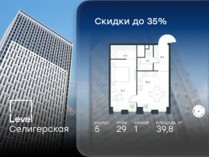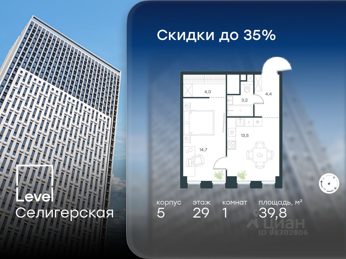 В жилом квартале, расположенном в южной части района Западное Дегунино, продаётся 1-комнатная квартира площадью 39.80 кв.м без отделки. Квартира расположена на 29 этаже 40-этажного корпуса 5 в жилом комплексе комфорт-класса Level Селигерская (компания Level Group/Левел групп).