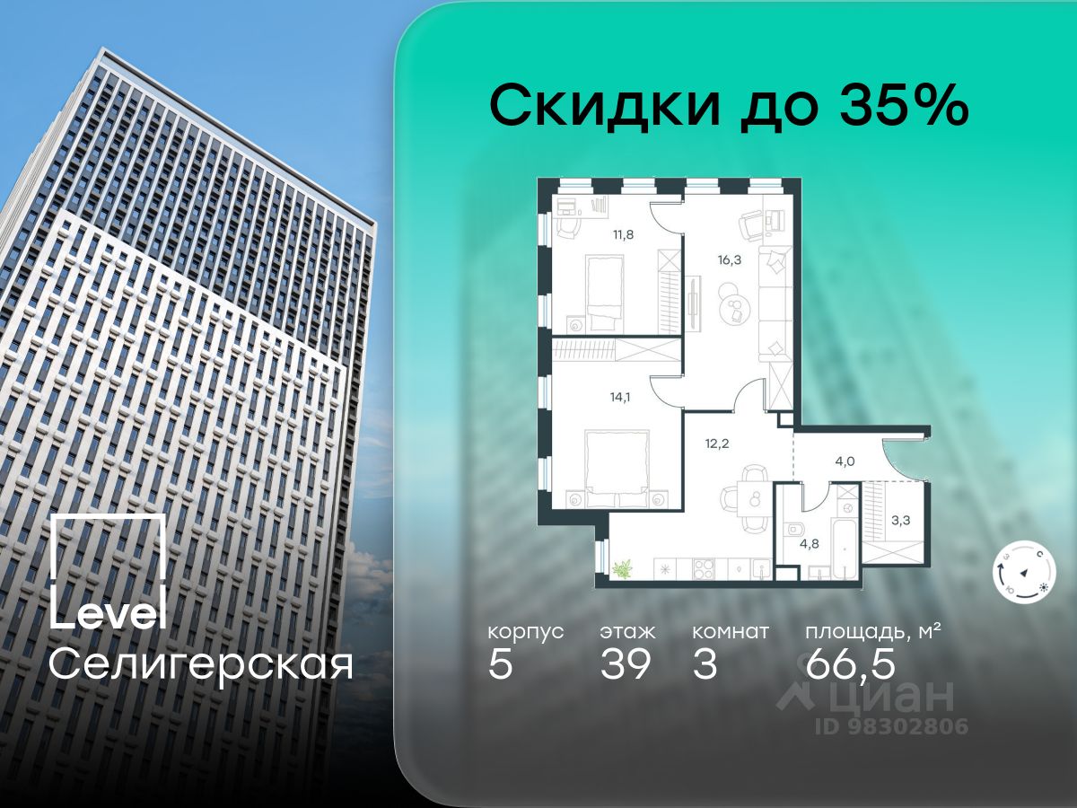 В жилом квартале, расположенном в южной части района Западное Дегунино, продаётся 3-комнатная квартира площадью 66.50 кв.м без отделки. Квартира расположена на 39 этаже 40-этажного корпуса 5 в жилом комплексе комфорт-класса Level Селигерская (компания Level Group/Левел групп).