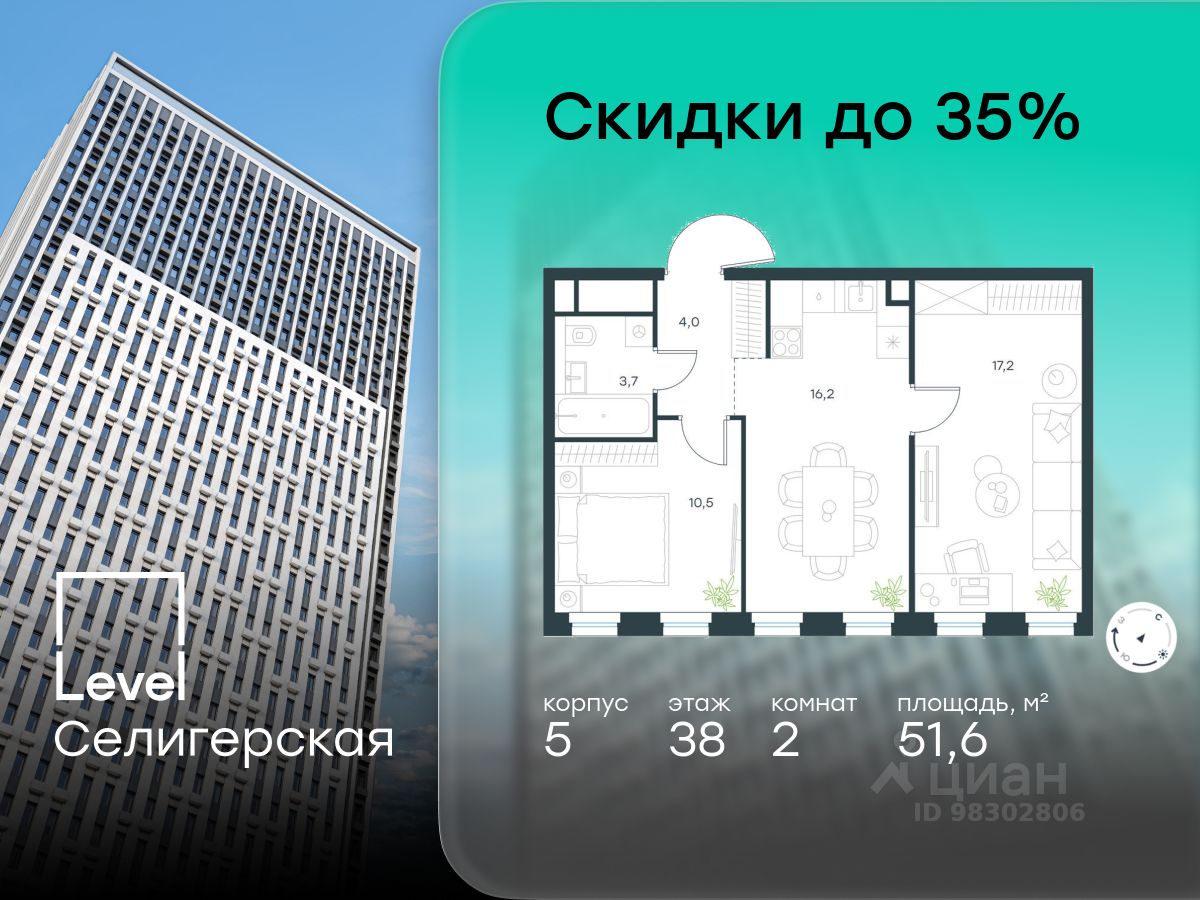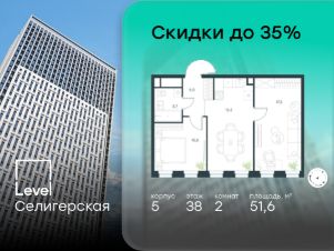 В жилом квартале, расположенном в южной части района Западное Дегунино, продаётся 2-комнатная квартира площадью 51.60 кв.м без отделки. Квартира расположена на 38 этаже 40-этажного корпуса 5 в жилом комплексе комфорт-класса Level Селигерская (компания Level Group/Левел групп).