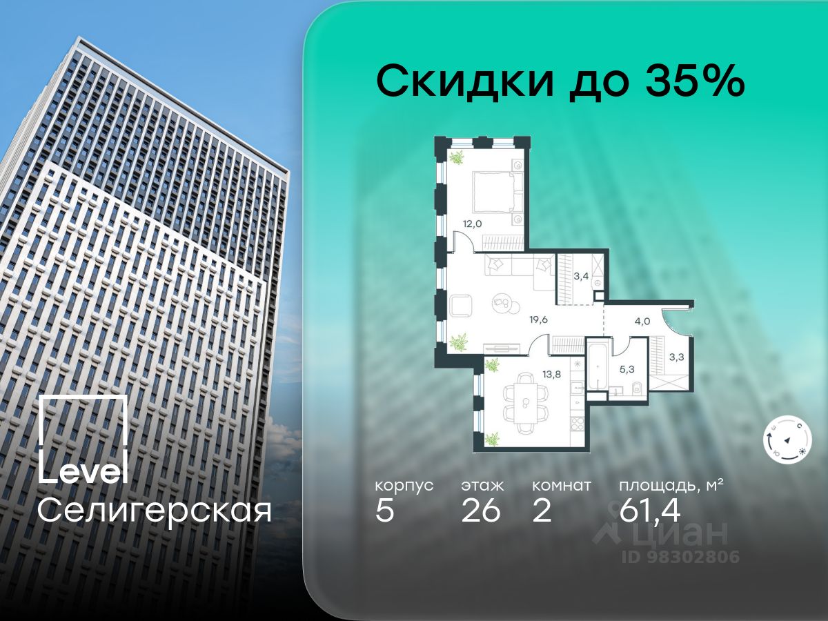 В жилом квартале, расположенном в южной части района Западное Дегунино, продаётся 2-комнатная квартира площадью 61.40 кв.м без отделки. Квартира расположена на 26 этаже 40-этажного корпуса 5 в жилом комплексе комфорт-класса Level Селигерская (компания Level Group/Левел групп).