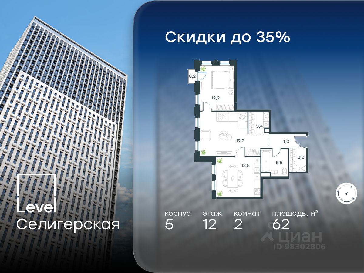 В жилом квартале, расположенном в южной части района Западное Дегунино, продаётся 2-комнатная квартира площадью 62.00 кв.м без отделки. Квартира расположена на 12 этаже 40-этажного корпуса 5 в жилом комплексе комфорт-класса Level Селигерская (компания Level Group/Левел групп).