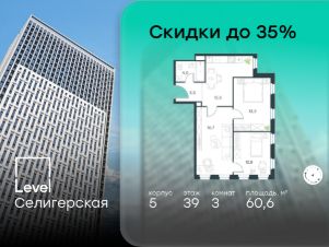 В жилом квартале, расположенном в южной части района Западное Дегунино, продаётся 3-комнатная квартира площадью 60.60 кв.м без отделки. Квартира расположена на 39 этаже 40-этажного корпуса 5 в жилом комплексе комфорт-класса Level Селигерская (компания Level Group/Левел групп).