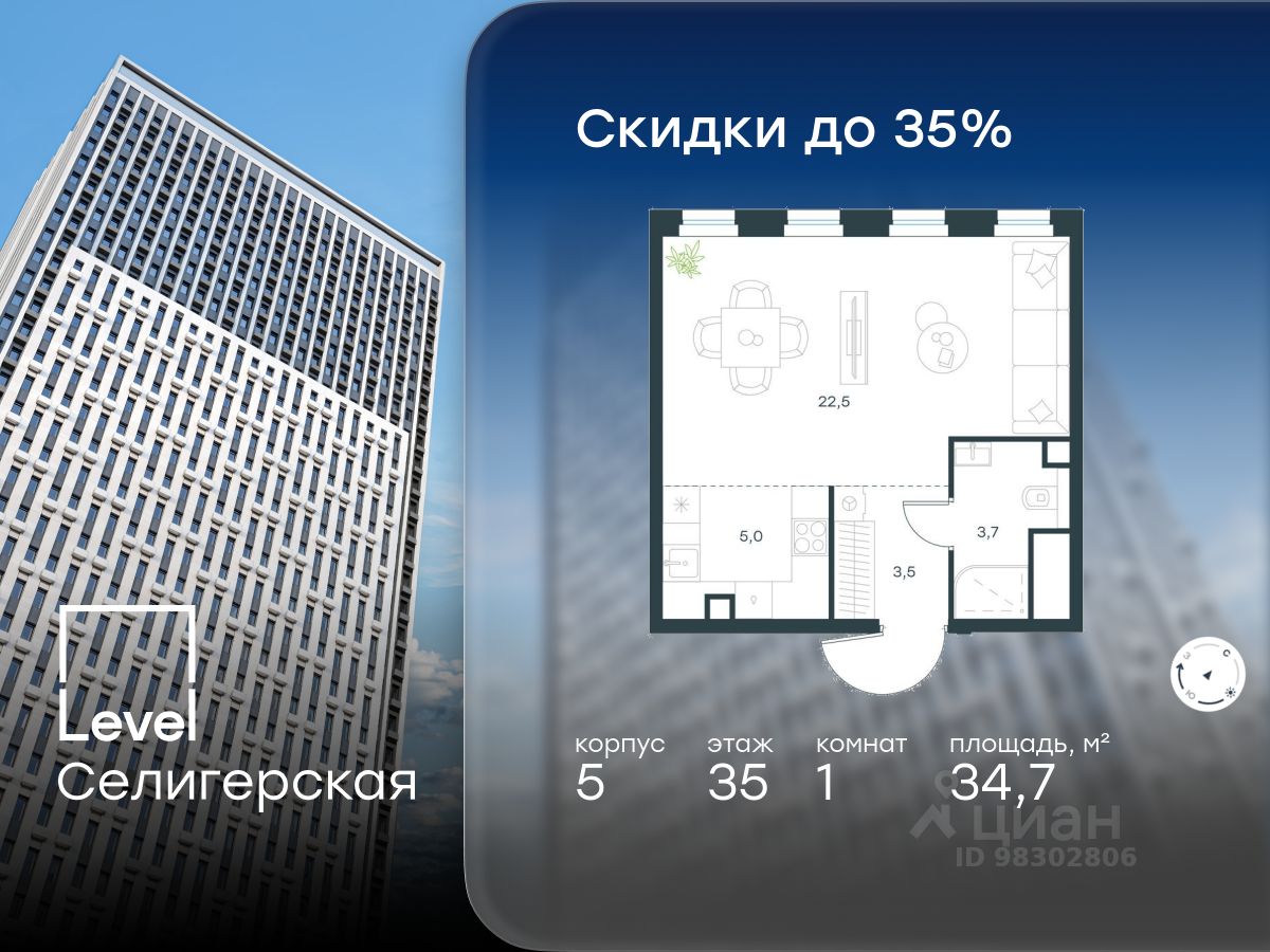 В жилом квартале, расположенном в южной части района Западное Дегунино, продаётся 1-комнатная квартира площадью 34.70 кв.м без отделки. Квартира расположена на 35 этаже 40-этажного корпуса 5 в жилом комплексе комфорт-класса Level Селигерская (компания Level Group/Левел групп).