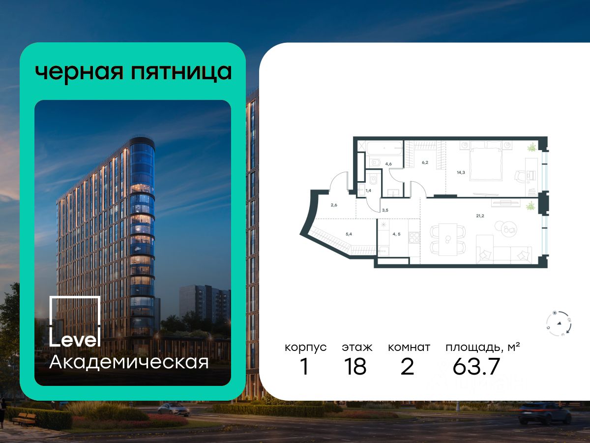 В Академическом районе продаётся 2-комнатная квартира площадью 63.70 кв.м без отделки. Квартира расположена на 18-м этаже 19-этажного жилого комплекса бизнес-класса Level Академическая (компания Level Group).