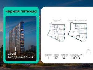 В Академическом районе продаётся 4-комнатная квартира площадью 100.30 кв.м без отделки. Квартира расположена на 17-м этаже 19-этажного жилого комплекса бизнес-класса Level Академическая (компания Level Group). В данной квартире вы можете оборудовать второй этаж (антресоль). Устройство антресольного этажа выполняется собственником самостоятельно как перепланировка квартиры. Нормативная площадь антресоли - не более 40% от площади квартиры.
