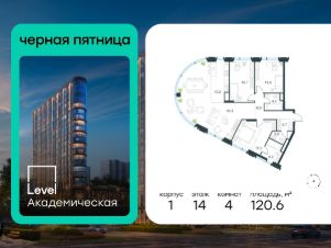 В Академическом районе продаётся 4-комнатная квартира площадью 120.60 кв.м без отделки. Квартира расположена на 14-м этаже 19-этажного жилого комплекса бизнес-класса Level Академическая (компания Level Group).