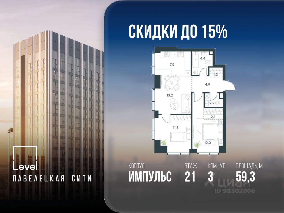В Даниловском районе столицы (ЮАО) продаётся 3-комнатная квартира площадью 59.30 кв.м без отделки. Квартира расположена на 21 этаже 45-этажного корпуса 'Горизонт' в жилом комплексе бизнес-класса Павелецкая Сити. Высота потолков 3.00м.