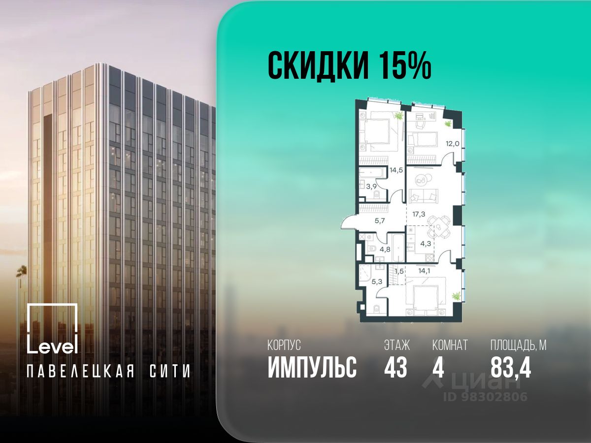 В Даниловском районе столицы (ЮАО) продаётся 4-комнатная квартира площадью 83.40 кв.м без отделки. Квартира расположена на 43 этаже 45-этажного корпуса 'Горизонт' в жилом комплексе бизнес-класса Павелецкая Сити. Высота потолков 3.00м.