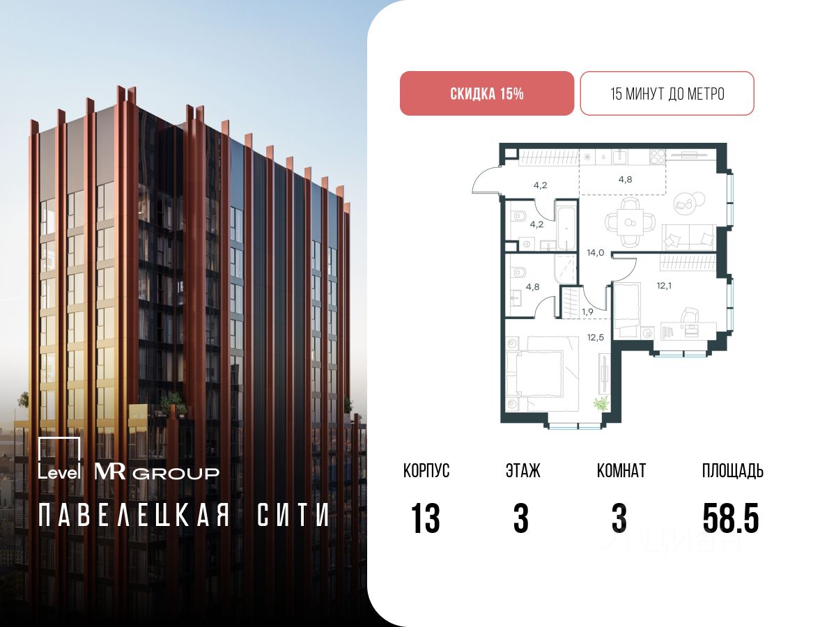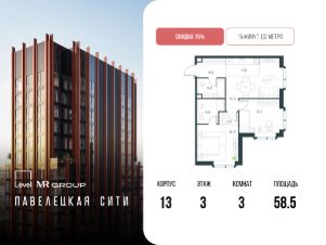 В Даниловском районе столицы (ЮАО) продаётся 3-комнатная квартира площадью 58.50 кв.м без отделки. Квартира расположена на 3 этаже 20-этажного корпуса 'Горизонт' в жилом комплексе бизнес-класса Павелецкая Сити. Высота потолков 3.00м.