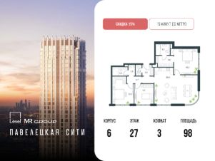 В Даниловском районе столицы (ЮАО) продаётся 3-комнатная квартира площадью 98.00 кв.м без отделки. Квартира расположена на 27 этаже 27-этажного корпуса 'Горизонт' в жилом комплексе бизнес-класса Павелецкая Сити. Высота потолков 3.00м.